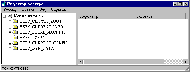 | Шаг 12 - Реестр Windows (Обзор) Всем знаком реестр Windows. Этакая общая база для операционки и ее приложений. В принципе большинство программистов копались с реестром, у некоторых нормально обошлось, у других не очень. Но это неважно. Главное, всегда делать резервную копию. Вот о них мы и поговорим. В общем случае пользователь редактирует реестр с помощью утилиты regedit. Она запускается легче всего через Пуск-Выполнить..., где в окне впечатывается regedit. После этого Вашему взору должно предстать что-то вроде этого: В левой части иерархическая структура реестра - разделы, подразделы. Как видно, он имеет иерархическую структуру. В принципе это похоже на окно проводника. В левой части окна видны параметры. У каждого раздела есть параметр по имени "По умолчанию" или в английской версии "Default". Я, когда в первый раз это услышал, удивился - как же программы смогут считывать его значение, если в разноязычных версиях у него разные имена? Однако выяснилось, что это регедит как бы облегчает пользователям жизнь - настоящее имя параметра "". На самом деле интернационально ;). В реестре есть шесть главных разделов - HKEY_CLASSES_ROOT, HKEY_CURRENT_USER, HKEY_LOACAL_MACHINE, HKEY_USERS, HKEY_CURRENT_CONFIG, HKEY_DYN_DATA. Я их юуду называть сокращенно, например HKLM означает HKEY_LOCAL_MACHINE. HKCR содержит информацию в основном о файлах, документах OLE и прочем. В нем хранятся такие полезные вещи, как информация о файле по расширению - иконка по умолчанию, контекстное меню, команда выполнения по двойному щелчку. HKCU хранит информацию о текущем пользователе. Если не ошибаюсь, этот раздел строится динамически по загрузке Windows. В нем, как и в HKLM и HKU, есть раздел Software/CLASSES, содержащий практически ту же информацию, что и HKCR. Раздел HKLM, как и положено по названию, хранит информацию об установленных программах и его настройках. HKU - информация, относящаяся ко всем пользователям. Несмотря на, казалось бы, ответственную функцию, в его раздел .Default обычно кидают программы всякую дрянь, которую в другие места бросить стыдно. HKCC содержит, как понятно, информацию и текущей конфигурации. Правда, у обычных пользователей эта конфигурация обычно одна, но неважно. Вообще в этом разделе ничего интересного практически нет, поскольку если с другими разделами копаться более-менее безопасно, то здесь я делать это не рекомендую. HKDD - раздел, который строится динамически по мере загрузки Windows. В NT 2000 через него можно было что-то поменять, а в 9x в нем хранятся в основном PnP настройки и все в таком роде. Этот раздел частично создается из других. В общем-то это и есть иерархия знаменитого реестра. В C++Builder довольно унифицированная система управления реестром, через специальный класс TRegistry. Работа с реестром в основном заключается в считывании определенных параметров и их записи и создания и удаления разделов. Этот класс все это позволяет. Нужно сказать, что значения параметров в реестре могут быть строкового, двоичного и типа double word. Последний эквивалентен int. Класс TRegistry будет подробно рассмотрен в следующем Шаге.