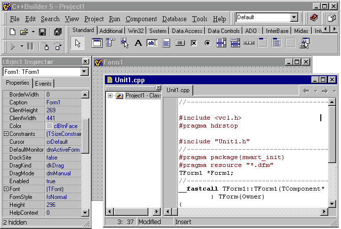 | Все материалы взяты с открытых источников!!! Шаг 1 - Знакомство с С++ Builder 5 Этот раздел рассказывает об объектно-ориентированном программировании в среде C++ Builder 5. Правда, я не рассказываю об общем синтаксисе C++, где нужно, просто даю пояснения о расширениях. Я рекомендую прочитать какую-нибудь из книг именно по C++, например Бьярна Страустрапа "Введение в C++". Язык C++, используемый в этой системе, не сильно отличается от стандарта ANSI. Он дополнен некоторыми ключевыми словами, позволяющими использовать в полной мере преимущества Windows-программирования. Прежде, чем приступить к описанию этой системы, я должен, как и любой автор, отметить, что C++ Builder и Delphi похожи, как близнецы-братья. Хотя это заезженная истина, но, тем не менее, несмотря на похожесть, методы программирования на них отличаются. Впрочем, переход от одной системы к другой не будет особенно затруднительным. Вот такой дисклеймер :). Стандартной библиотекой C++ Builder является VCL, а не MFC или OWL, как в других системах программирования на C++ под Windows. VCL - библиотека визуальных компонентов. Их вид можно менять на стадии проектирования, а не только на стадии выполнения (run-time). Тем не менее, C++ Builder позволяет использовать и эти две библиотеки. Также возможно прямое обращение к функциям Windows API и вызов из DLL. В общем, куда хочешь залезь и что хочешь запусти. С++ Builder поставляется в трех вариантах - Standard, Professional и Enterprise. Для нас большой разницы в цене нет благодаря отечественным морякам CD дисков, так что я буду рассматривать все примеры на базе Enterprise. Вариант Enterprise позволяет работать с COM и CORBA, базами данных (SQL, Paradox, dBase, MS OLE DB, Access 97, FoxPro, InterBase, Oracle, Sybase, Informix, DB2), Интернетом(TCP/IP, HTTP, FTP, NNTP, SMTP, POP3, CGI, WinCGI, ISAPI, NSAPI). Кроме того, содержит встроенные средства интегрированной отладки, о которых я расскажу в следующих шагах. Инсталляция обычно проходит без проблем, главное, не забудьте посмотреть код диска. Кто не знает, его обычно пишут в .diz файле или Lisense.txt. Я думаю, сейчас я рассказал достаточно, чтобы приступить к этакому quick-tour'у по C++ Builder. Для начала ознакомимся со средой программирования: На экране 4 окна - главное(верхнее), окно Инспектора объектов слева, Редактора кода справа и Дизайнер форм под окном Редактора. В главном окне видна Палитра компонентов. Палитра - один из основных методов ускоренного программирования. На палитре размещены компоненты VCL на нескольких вкладках. Название каждой из вкладок довольно хорошо характеризует ее содержимое. Палитра используется вместе с Дизайнером форм. Чтобы создать на форме компонент, выберите его на Палитре и растяните по необходимым размерам на форме. Дизайнер отображает форму практически в том виде, в котором она будет при запуске, если вы, конечно, не создадите какие-то компоненты "at run-time". Для модификации внешнего вида и параметров компонента, а также задания обработчиков(handlers) событий, используйте Инспектор объектов. Для этого выберите какой-то компонент на форме или из выпадающего списка (сама форма - тоже компонент), и на первой вкладке вы увидите свойства данного объекта, а на второй вкладке - обработчиков событий. Для создания нового обработчика или перехода к уже имеющемуся используйте двойной щелчок по соответствующей строке Инспектора. Это приведет вас к тексту в окне Редактора (а куда же еще :)). Также существует некоторое количество других окон, некоторые из ко