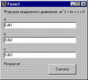 void __fastcall TForm1::Button1Click(TObject *Sender) { double a,b,c; a=Edit1->Text.ToDouble(); b=Edit2->Text.ToDouble(); c=Edit3->Text.ToDouble(); int d=b*b+4*a*c; if (d<0){ Label6->Caption="Нет корней!!!"; return; }; double x1=(-b+sqrt(d))/(2*a); double x2=(-b-sqrt(d))/(2*a); Label6-<Caption=String(x1)+" ;\r\n "+String(x2); } Здесь, по-моему, все понятно - Edit1, Edit2 и Edit3 - соответствующие области ввода, а Label6 - надпись, здесь невидимая, поскольку с нулевым текстом, а в программе выводящая результат. Свойство Text объектов класса TEdit содержит введенную строку. Программа выводит полученные корни или говорит, что их нет. Честно говоря, пример далек от совершенства - программа не контролирует, вводятся числовые или символьные данные и при ошибке просто "вылетает". Но для общего ознакомления подходит (наверное). В этом примере использованы три класса компонентных объектов. Ниже приведены наиболее необходимые и специфичные свойства объектов этих классов. Одинаковые свойства, для экономии места, я не буду приводить по два раза. Про общие свойства и иерархию VCL будет рассказано в следующих шагах. Компонент TLabel * Caption - Определяет надпись, выводимую объектом * Align - Выравнивание метки * AutoSize - Автоматическое масштабирование метки по длине введенного текста * Enabled - Разрешена ли метка * Color - Цвет метки * Font - Стандартное свойство типа TFont. Содержит вложенные свойства, которые означают именно то, как они называются. Можно выбрать тип шрифта из открывающегося по двойному щелчку диалога. * ParentFont - Определяет, нужно ли использовать шрифт родителя по умолчанию. * Transparent - Прозрачность фона метки. * ShowAccelChar - Можно ли использовать "быструю клавишу", которая определяется символом после символа "&" и переводит фокус ввода на компонент, определенный в свойстве FocusControl. * WordWrap - Автоматический перенос слов, если они не умещаются на строке. Компонент TEdit * Anchors - Свойство типа множество, которое определяет, как будет изменяться длина компонента при изменении размеров формы. * BorderStyle - Окантовка области ввода. * Color - Цвет фона. * ReadOnly - Запрещает редактирование введенного текста. * PasswordChar - Отображение одного и того же символа (например, звездочки) вместо вводимого текста. Ну, вы сами знаете, зачем это нужно. * Text - Содержит введенную строку типа AnsiString. Вообще, этот тип является стандартным для VCL и будет подробно рассмотрен в дальнейшем. Компонент TButton * OnClick - Событие, возникающее при нажатии на кнопку клавишей мыши. * Cancel - Говорит о том, что при нажатии клавиши ESC или закрытии дилогового окна используется обработчик события OnClick() данной кнопки. * Default - Кнопка выбирается по умолчанию и обводится рамкой. * Caption - Подпись на кнопке. * ModalResult - В модальных диалоговых окнах значение этого свойства, не равное mrNone, при нажатии на кнопку закроет окно и запишет свое значение в свойство ModalResult формы. * PopupMenu - Контекстное меню, выходящее при нажатии на компонент правой кнопкой мыши. Вот. На одном дыхании целый шаг написал. Ну, пока хватит, а то клавиатура устала