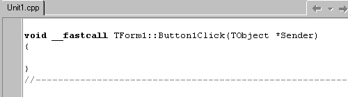 | Шаг 2 - Первый проект [TLabel, TEdit, TButton] Новый проект создается автоматически при запуске C++ Builder. Также можно выбрать команду File->New Application или открыть т.н. "Хранилище новых объектов" командой File->New. Итак, каким-то из способов мы сделали начальную программу. Теперь сделаем что-то, преследующее банальную, но подходящую цель - решение квадратного уравнения. Перетащите на форму компоненты TLabel , TEdit и TButton и разместите, как показано на рисунке (чтобы разместить сразу несколько компонентов, нажмите на его кнопку при нажатой клавише Shift). Чтобы модифицировать размеры компонентов, нужно ввести соответствующие значения в свойства Top, Left, Width, Height Инспектора или мышью навести на угол компонента и перетащить его. Короче, визуально. Для изменения имени выбранного компонента используйте свойство Name. Чтобы модифицировать надписи этих компонентов, нужно изменить свойство Caption в Инспекторе объектов. Для определения обработчика события OnClick(), которое возникает при нажатии на объект кнопкой мыши, можно пойти двумя путями: ввести имя или выбрать его из списка доступных в правой вкладке Инспектора, или просто два раза щелкнуть по кнопке. После этого в Редакторе откроется место для ввода кода: Это, собственно, и есть процедура обработки события. Сюда нужно ввести следующие строчки: Code #include <math.h>