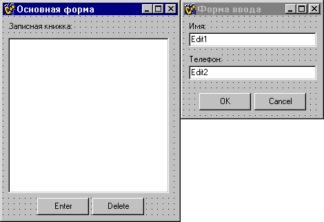 void __fastcall TForm1::DeleteClick(TObject *Sender) { ListBox1->Items->Delete(ListBox1->ItemIndex); } Вот и все! Этого кусочка текста хватает, чтобы отобразить две формы записной книжки. Честно говоря, в OWL пришлось бы написать побольше. Главное, не забывать включать заголовочный файл другой формы, и все ее компоненты будут как на ладони.