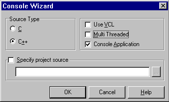 | Шаг 8 - Консоль [спецификаторы printf, функции getc, getchar] Казалось бы, какая устаревшая вещь. Тем не менее, я считаю, что уметь с ней работать необходимо, даже в наш виндусиный век :). Например, приложениям сервера или чего-то в этом роде предпочтительней работать в консольном режиме, какие-то классы, например строковый, тестировать удобнее в консоли. Короче, приступлю к объяснению. Консоль в C++Builder сильно напоминает юниксовую, тот же stdin, stdout и все в том же духе. При запуске программа как консоль выводит обыкновенное окно "Сеанс МС-ДОС", с интутитивным интерфейсом :). Чтобы создать консольное приложение, нужно выбрать команду File->New, и в списке создаваемых объектов выбрать Console Wizard. После этого выйдет такое диалоговое окно: Все флажки обозначают то, что написано. Можно выбрать язык исходных кодов, разрешить или запретить использование VCL. При снятом флажке VCL можно выбрать или снять флажок multi-threaded, то есть многопоточный. В моем примере я обойдусь одним потоком. Флажок Console Application дает возможность выбрать, исполняется прграмма как консольное окно или как Win32. Все различие в том, что будет прописана функция WinMain или просто Main. Жмите OK и смотрите жиденький код в Редакторе. После Win32 Application как-то не впечатляет. Но тем не менее. В примере будет решена задача отображения в ответ на ввод символа его ASCII кода. При нажатии клавиши ESC, если не ошибаюсь, код #27, выход из программы. Обычный бесконечный цикл, стандарт для ДОС-программ. Текст должен быть такой: Code #include <stdio.h> #pragma hdrstop