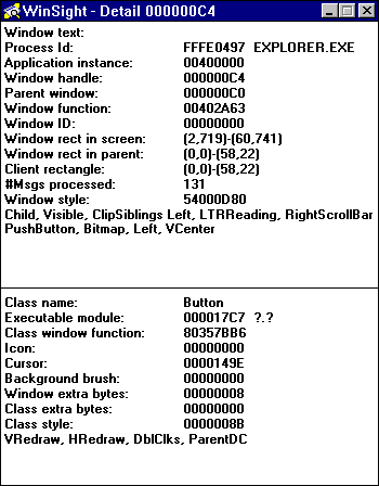 | Шаг 18 - WinSight Рассказать про WinSight я пообещал еще в позапрошлом Шаге, но сбился на функции WinAPI. Обещания нужно сдерживать, так что... WinSight - программа отслеживания окон, аналогичная Spy++. Я бы сказал, что Spy удобнее, но он идет в поставке не с Builder'ом, а с MS Visual Studio. Также WinSight прилагается к Delphi. Откопать эту прогу можно в Пуске, там же, где и Builder лежит. Что от такой программы нужно? Возможность визуального поиска окон, отображение их свойств, отслеживание сообщений и все в том же духе. Это все в программе есть. Начнем с поиска окон. Поиск окон Для этого есть несколько возможностей: Spy-FindWindow - в этом режиме при выделении окна в верхней части WinSight с помощью стрелок вверх-вниз оно (окно) обводится рамкой. Режим снимается при щелчке мышью. Spy-Follow focus - когда этот пункт отмечен, при получении фокуса каким-нибудь окном оно автоматически выделяется в WinSight. По-моему, самый удобный способ. Именно так я нашел HWND пуска. Просмотр свойств Значит нужное окно нашли. Теперь нужно выяснить его свойства. Как и положено, для этого нужно два раза щелкнуть по окну в списке WinSight. После этого появляется окошко: Все свойства, указанные в нем, совпадают с аналогичными в WinAPI, так что их подробно объяснять, наверное, не надо. Просмотр сообщений Просмотр сообщений можно включить командой Start! и отключить командой Stop. Настройки просмотра задаются в меню Messages. В нем можно настроить, какие процессы и сообщения будут трассироваться, и прочее. Я, правда, почти никогда этим не пользуюсь, обычно первого и второго хватает. Вот вроде бы и все основное, на что способен WinSight. В следующем Шаге я намерен завершить рассмотрение WinAPI.